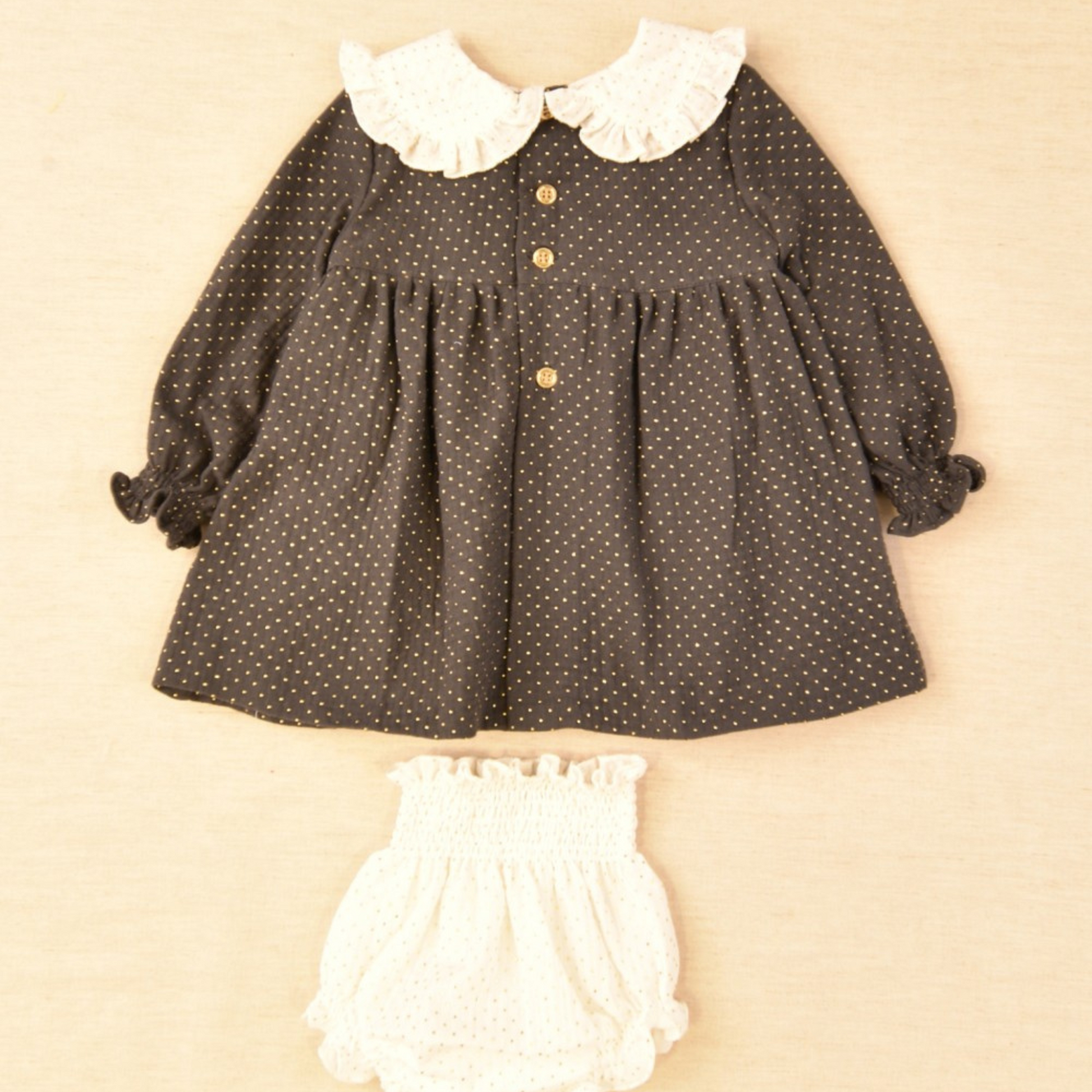 Denne babykjolen har et fantastisk design med mørkegrå og gullprikkmønster, som gir et snev av glamour til enhver anledning. Laget med materialer av høy kvalitet, er denne kjolen behagelig og myk på babyens følsomme hud. Denne kjolen er perfekt for fester og spesielle begivenheter.