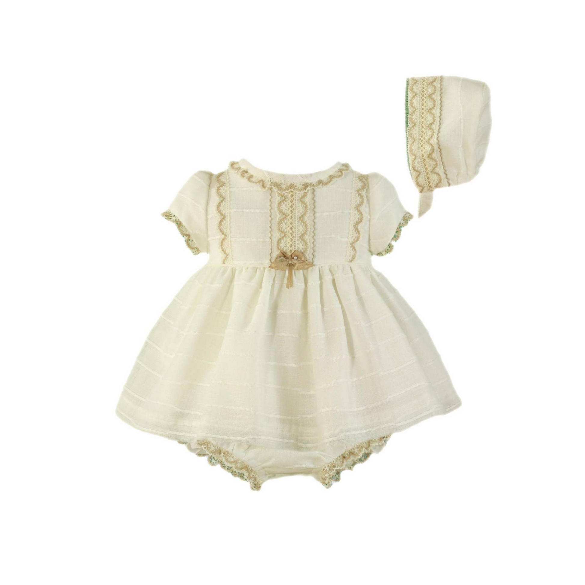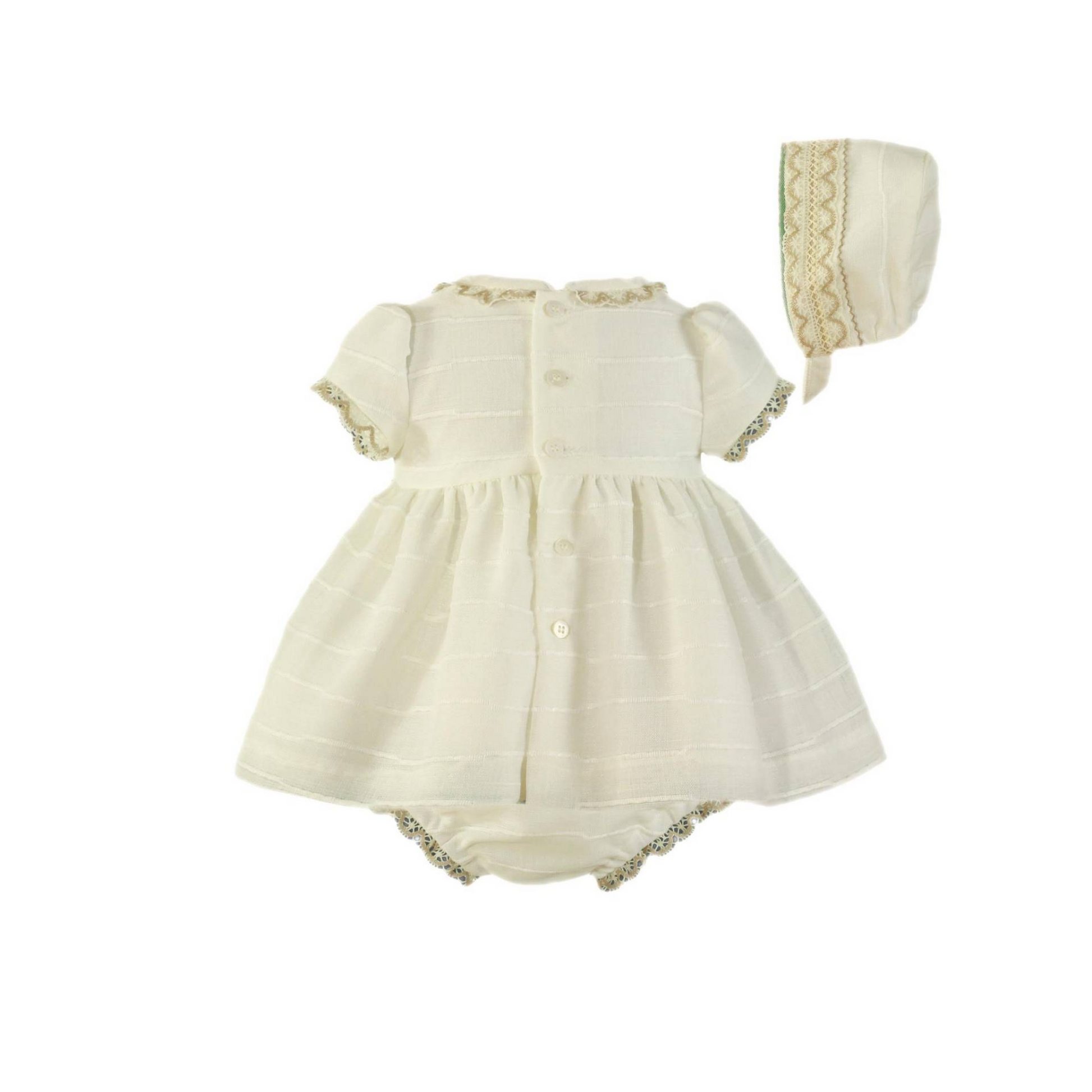 Dette elegante settet inneholder en vakker kjole, en matchende lue og bloomer. Kjolen har et elegant design med delikate detaljer og sjarmerende duse fargevalg.