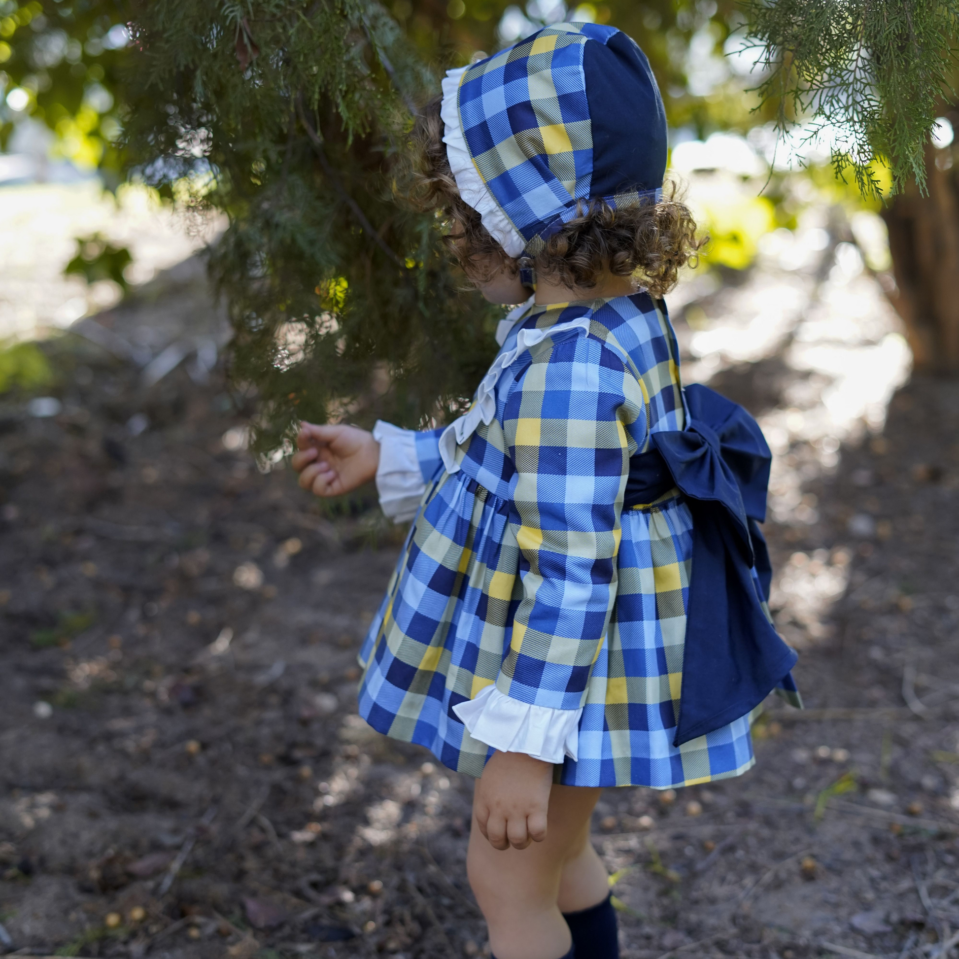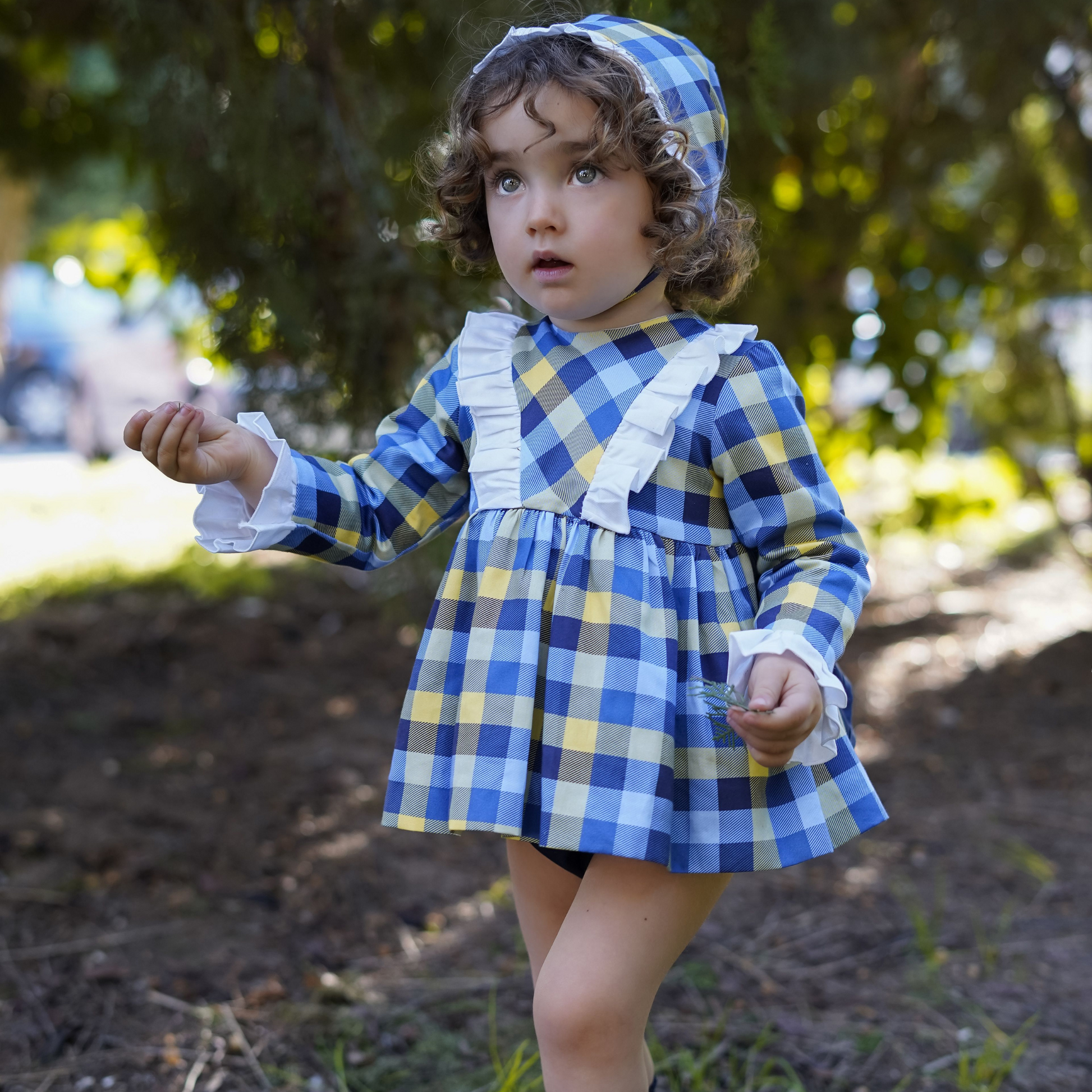 Dette elegante settet inneholder en vakker kjole, en matchende lue og bloomer. Kjolen har et elegant design med delikate detaljer og sjarmerende fargevalg.