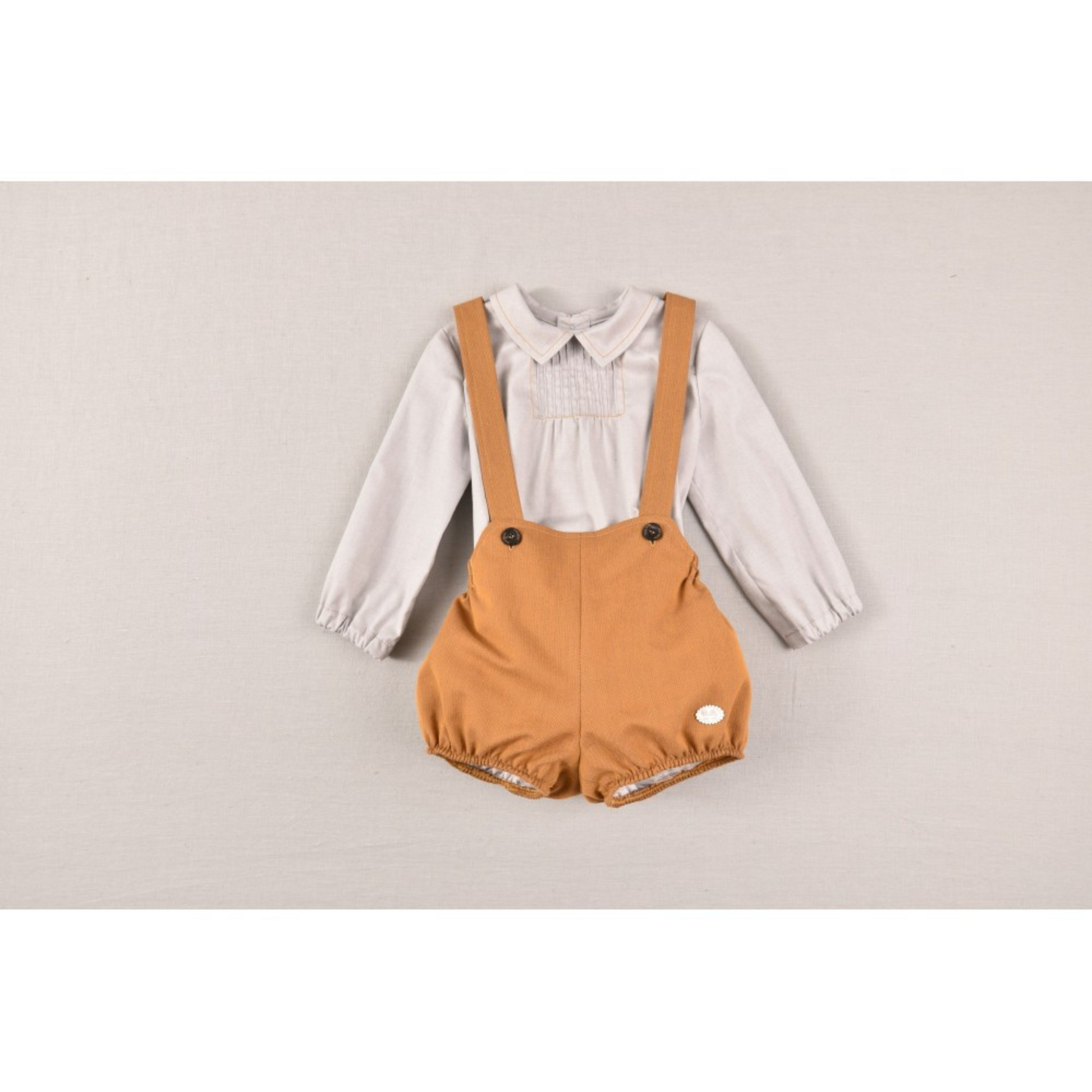 Dette stilige og allsidige antrekket inkluderer et par komfortable og trendy selebukse og en klassisk button-down-skjorte. Dette anrekket er perfekt for å kle opp den lille til spesielle begivenheter eller til hverdagsbruk.